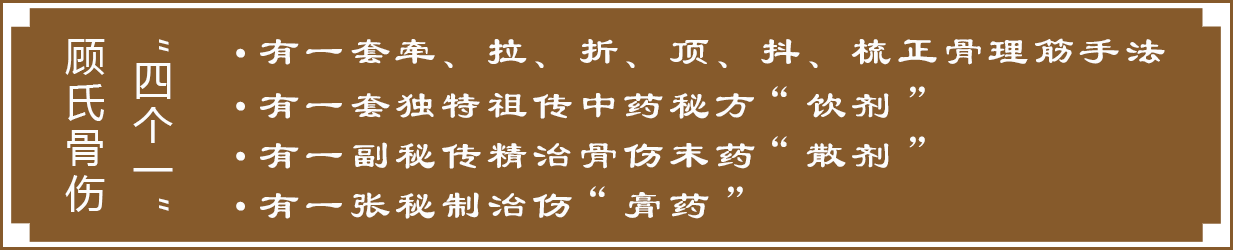 顧氏傷科具骨折、脫位閉合整復、小夾板固定、自制傷藥外敷和湯藥內(nèi)服療傷之特長,強調(diào)動靜結合,筋骨并重,內(nèi)外兼治,善于察言觀色、脈診及傷科疾病的辨癥論治,運用牽、拉、折、頂、抖、舒筋正骨的技能,形成整復、固定、藥物、功能鍛煉四步治傷要訣,獨特的治療特色,避免了病人手術創(chuàng)傷的痛苦。