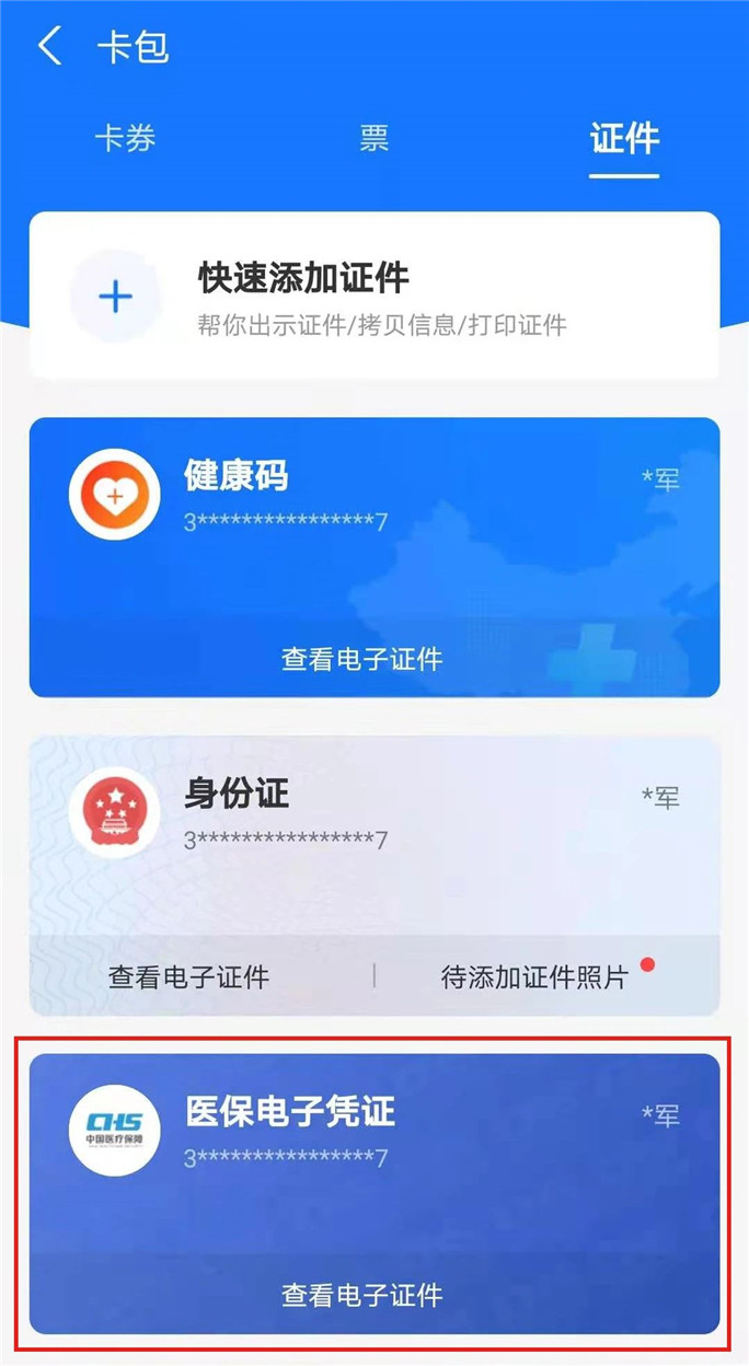 在卡包版塊點擊右上角“證件”按鈕切換到卡包證件界面,點擊“+添加證件”添加“醫(yī)保電子憑證”