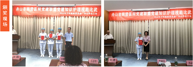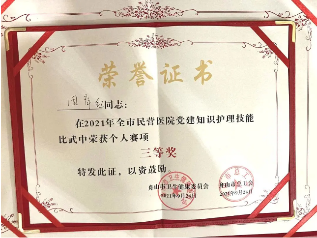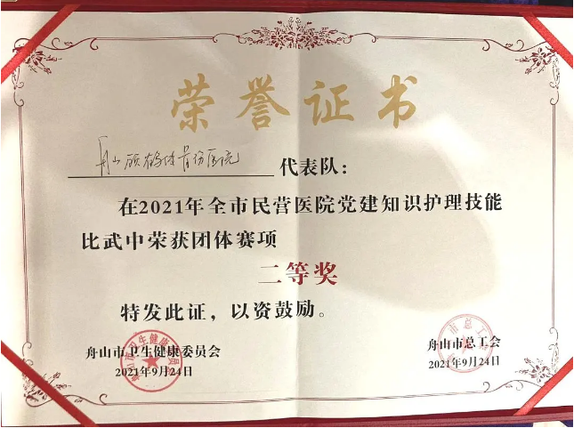 在舟山市衛(wèi)健委、舟山市兩新組織、舟山市總工會(huì)主辦,舟山市護(hù)理學(xué)會(huì)、舟山市民營(yíng)醫(yī)院黨建聯(lián)盟承辦的“第一屆舟山市民營(yíng)醫(yī)院黨建聯(lián)盟護(hù)理技能比武”活動(dòng)中,我院參賽隊(duì)伍憑借扎實(shí)的理論知識(shí)、熟練的實(shí)踐技能、靈活的臨床思維,從多名參賽選手中脫穎而出,以總分第二名榮獲大賽團(tuán)體二等獎(jiǎng),周育紅護(hù)士榮獲個(gè)人三等獎(jiǎng)。