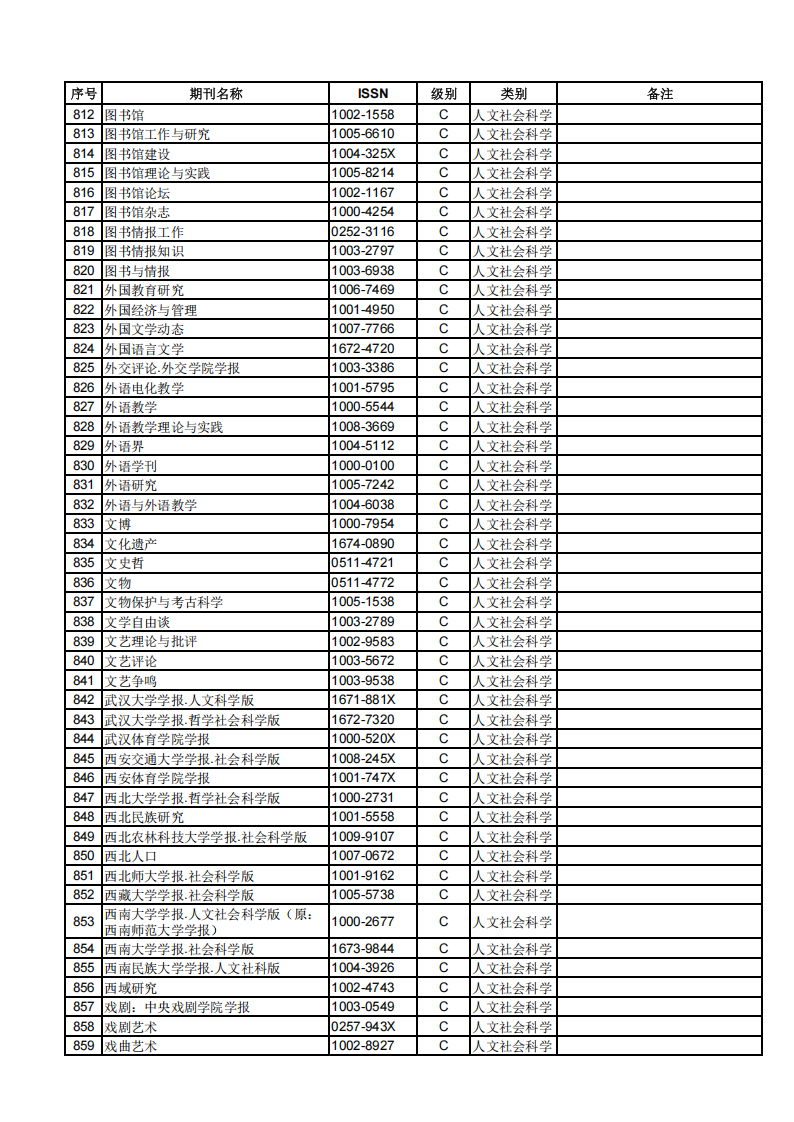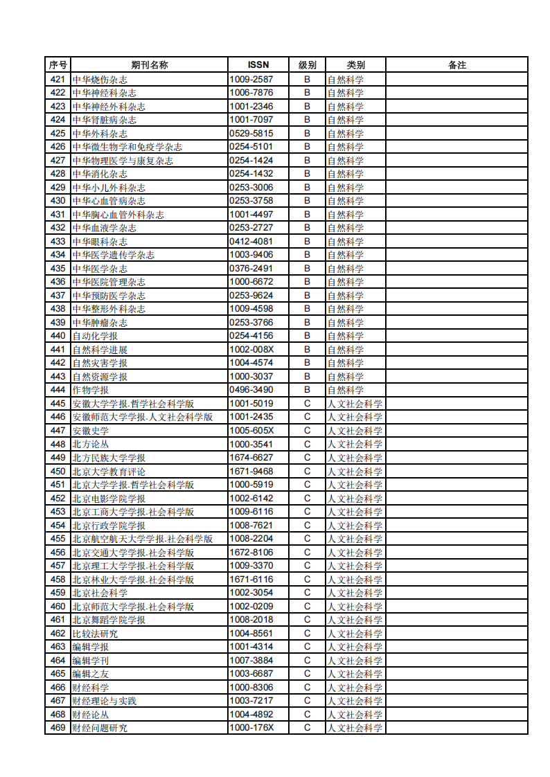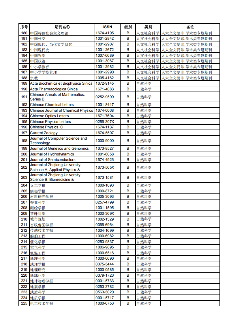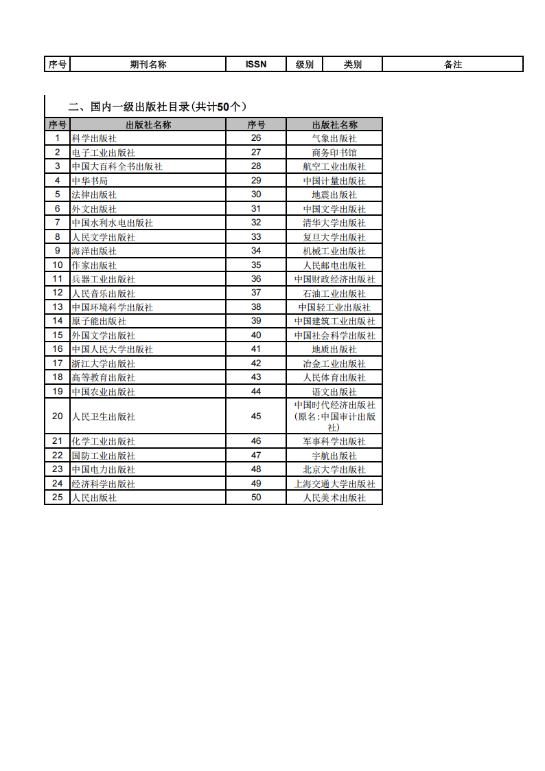 2、本目錄學術(shù)期刊分為A、B、C三類。A類包括SCI、EI、SSCI和A&HCI收錄的學術(shù)期刊論文以及人文社科類的權(quán)威期刊(A1類)20種和A2類學術(shù)期刊13種;B類411種(包括中國人民大學報刊復印資料(全文復印).學術(shù)類專題期刊92種),C類1270種。國內(nèi)一級出版社50個。