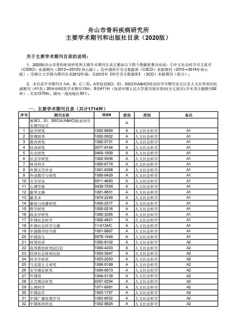 1、2020版舟山市骨科疾病研究所主要學術(shù)期刊目錄主要由以下四個數(shù)據(jù)庫整合而成:①中文社會科學引文索引(CSSCI)來源期刊(2012-2013年核心版);②中國科學引文數(shù)據(jù)庫(CSCD)來源期刊(2013-2014年核心版);③浙江大學國內(nèi)期刊名錄2012年版;④2013年《科學引文數(shù)據(jù)庫》(SCD)來源期刊(部分)。